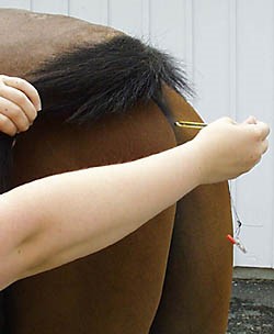 The temperature is taken by inserting the thermometer into the anus of the horse and holding against the side of the rectum. Do not stand directly behind the horse when taking the temperature. Low readings may be taken if the thermometer is inserted into a piece of faeces by accident. It is important to seek advice from your veterinary surgeon if you are inexperienced at this.